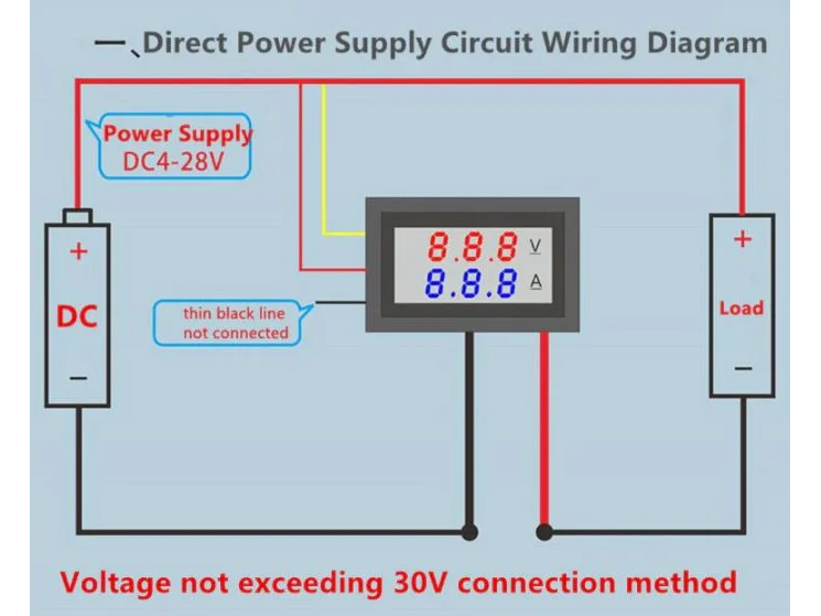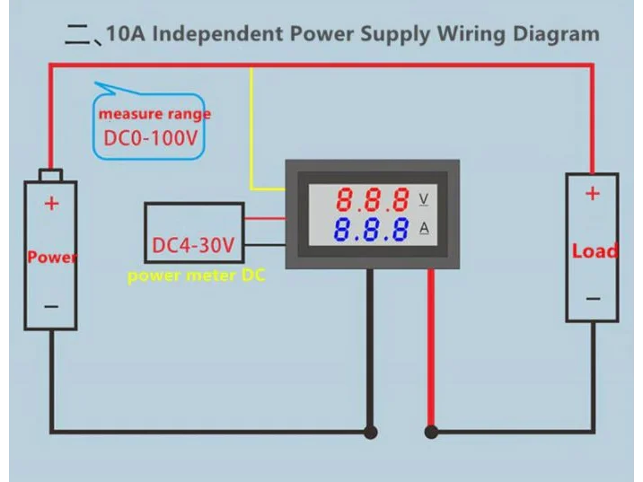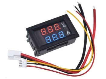Nyttigt lille panelmeter til overvågning af DC spænding og strømforbrug. Bredt måleområde fra 0-100Vdc og 0-10A.